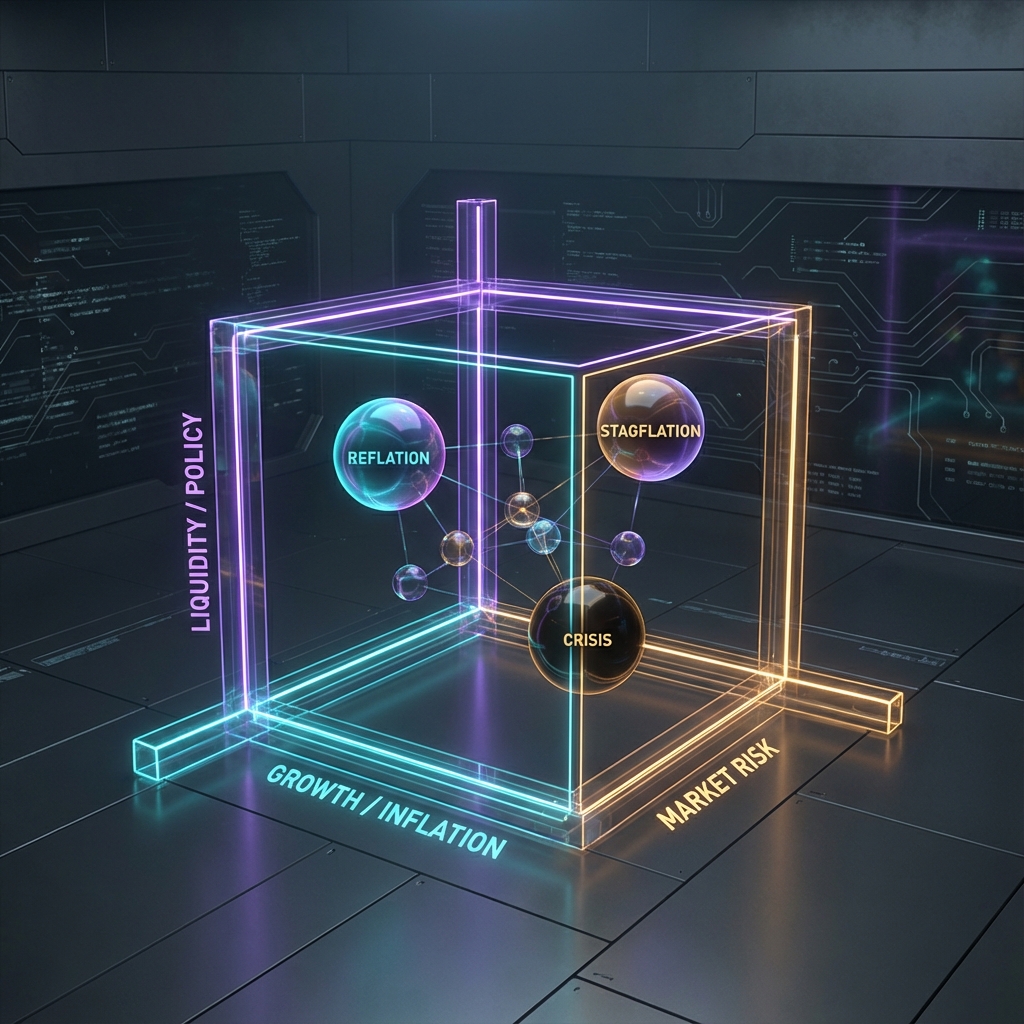 - Classifies regimes from three inputs: Real Cycle (growth/inflation), Liquidity & Policy, and Market Risk (stress/sentiment).